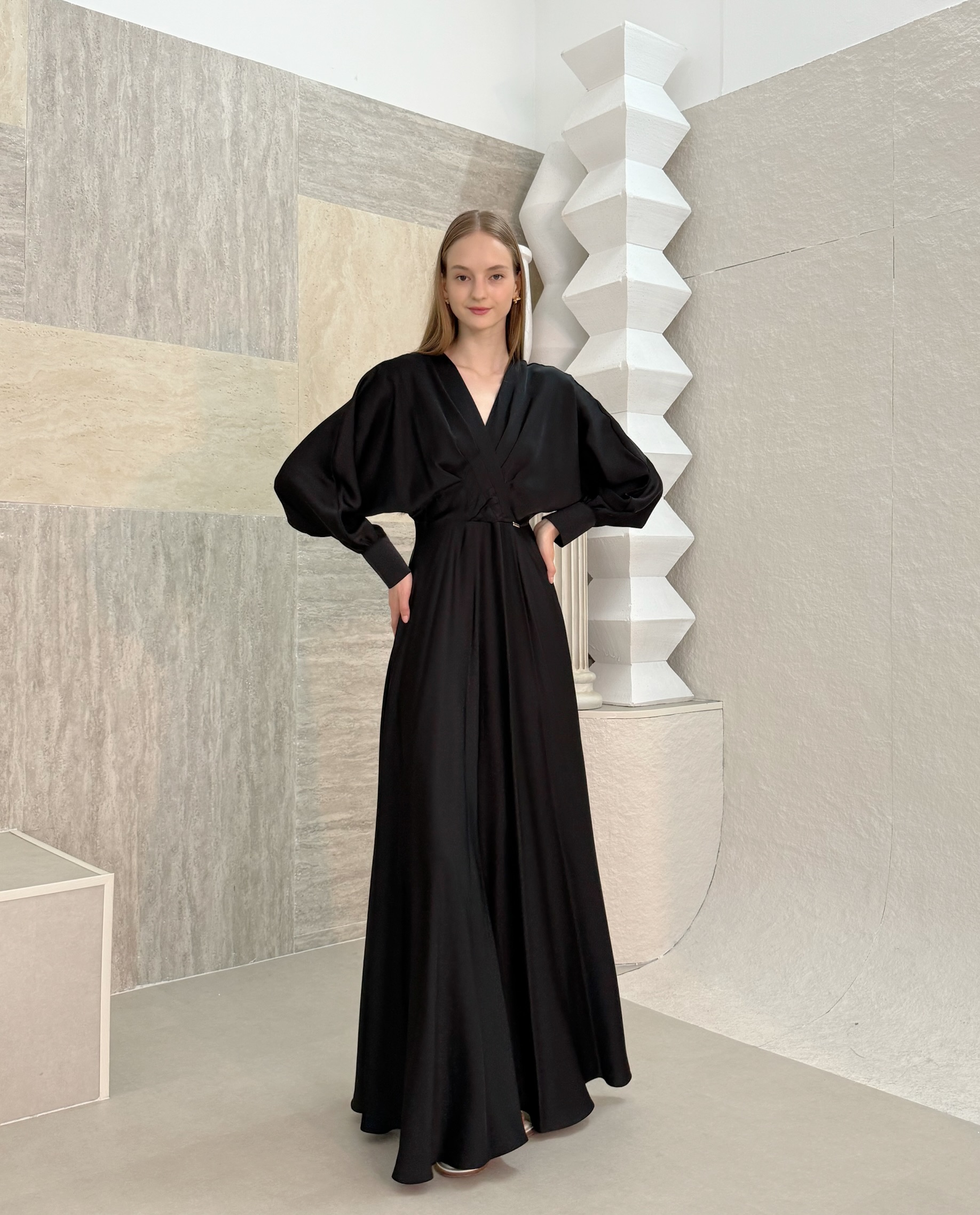 This elegant black silk gown features a timeless V-neckline and a sleek, floor-length silhouette. The long sleeves are accented with three delicate buttons at the cuffs, adding a refined and sophisticated touch. Smooth, flowing, and effortlessly chic, it’s perfect for formal evenings and special occasions.