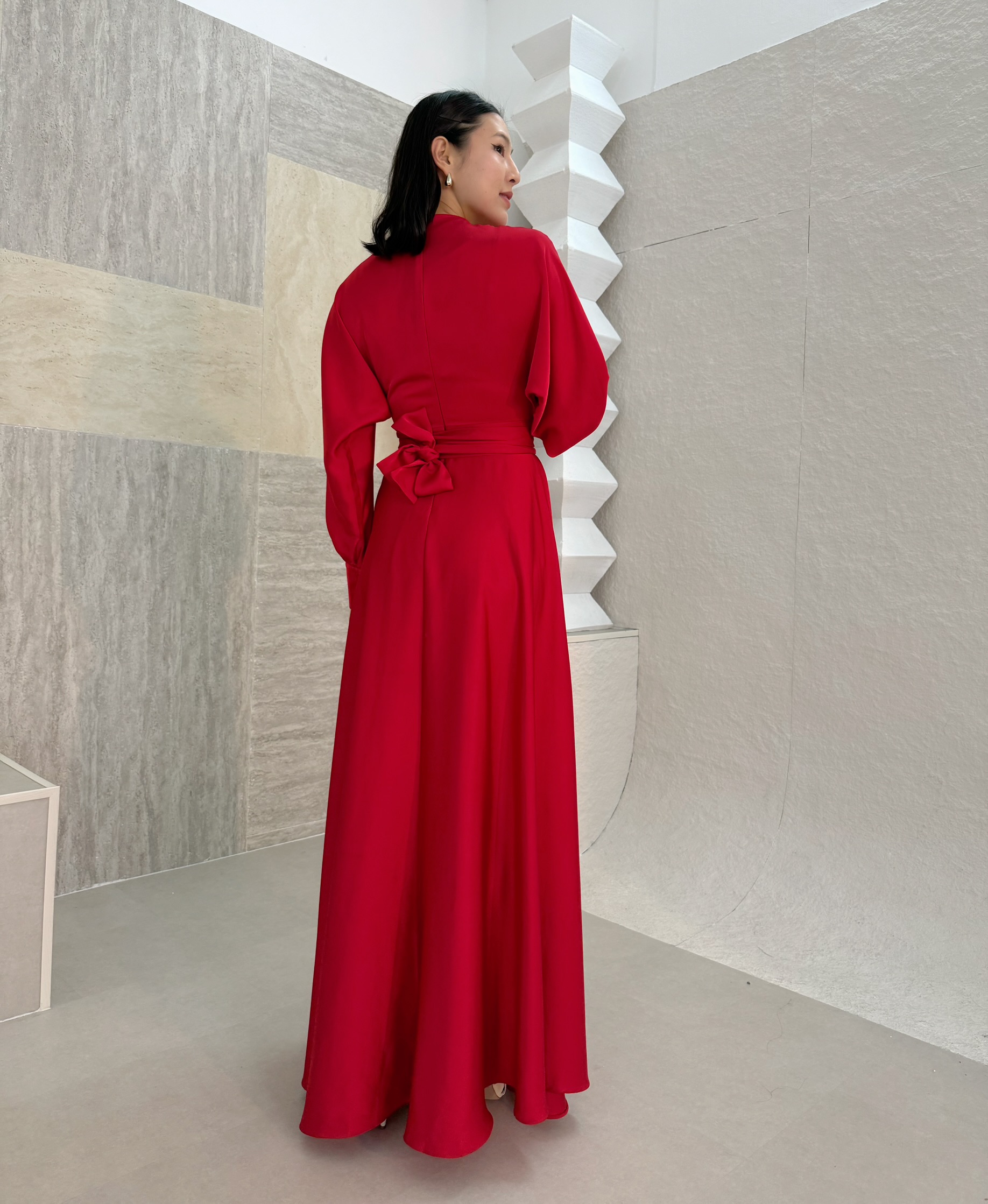 This stunning red silk gown features a classic V-neckline and a floor-length silhouette that flows elegantly with every step. The long sleeves are detailed with three delicate buttons at the cuffs, adding a touch of sophistication. Bold, luxurious, and effortlessly glamorous, it’s perfect for making a statement at any special occasion.