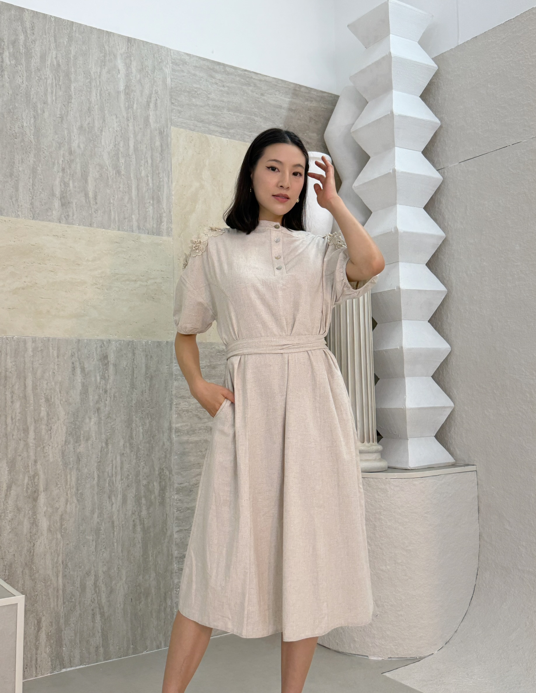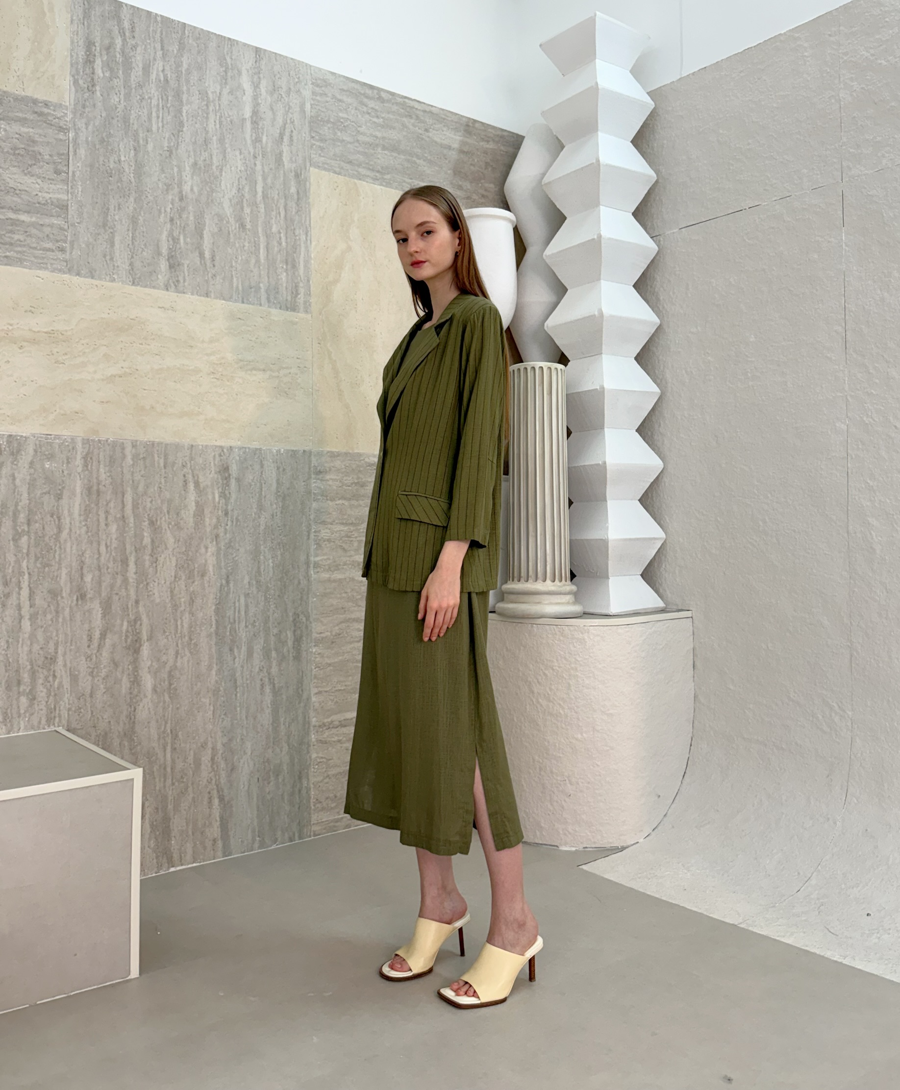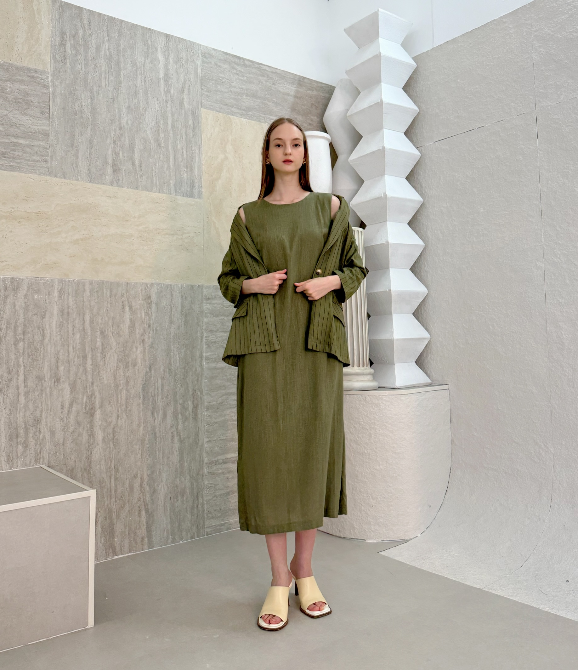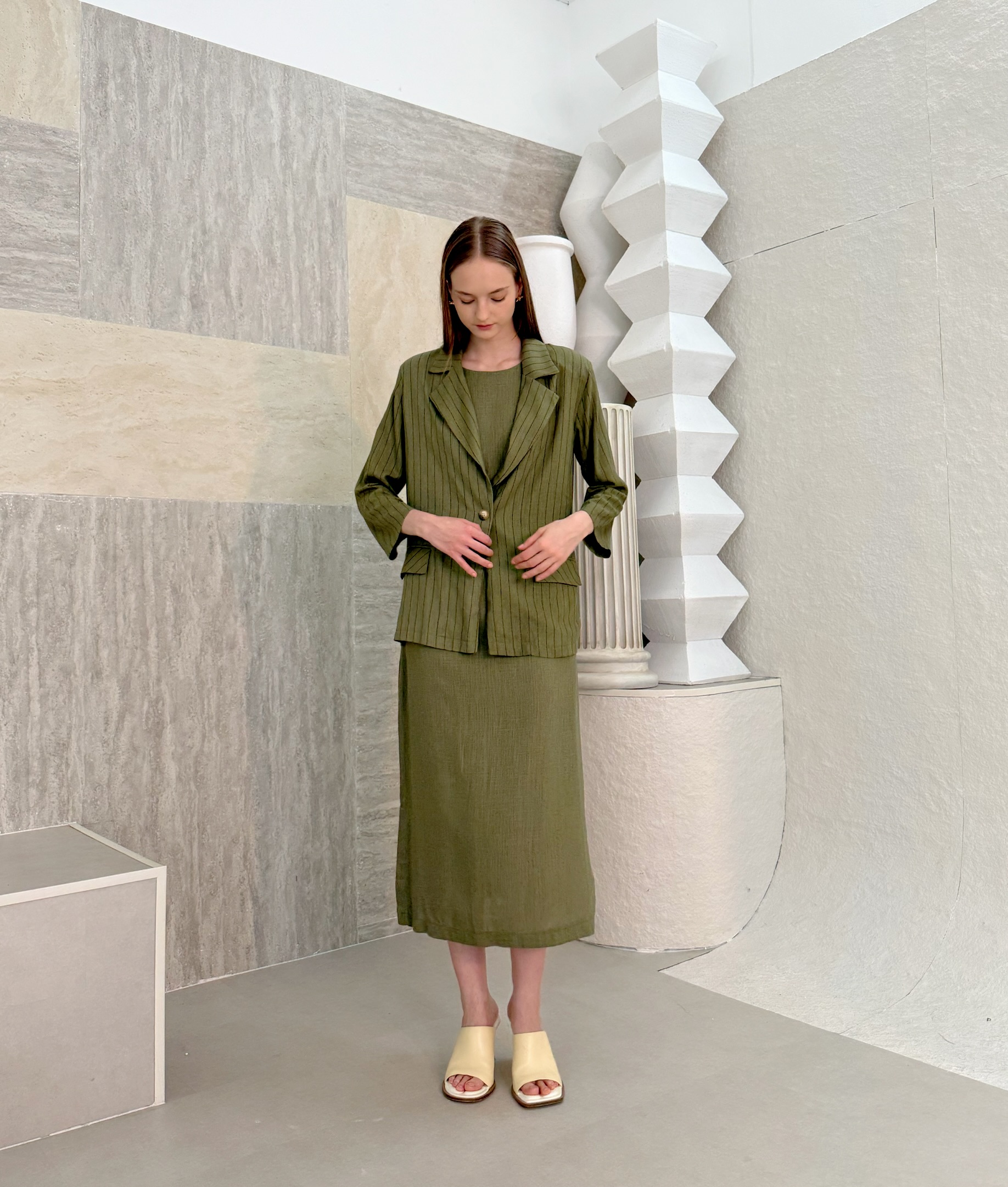 Effortlessly elegant olive-green wrap dress that flatters every shape. With comfortable breathable oversized blazer that has one button in the middle, it’s ideal for sunset dinners or slow coastal mornings. Natural tones, timeless spirit. Soft fading lines on the blazer with attention to the details.